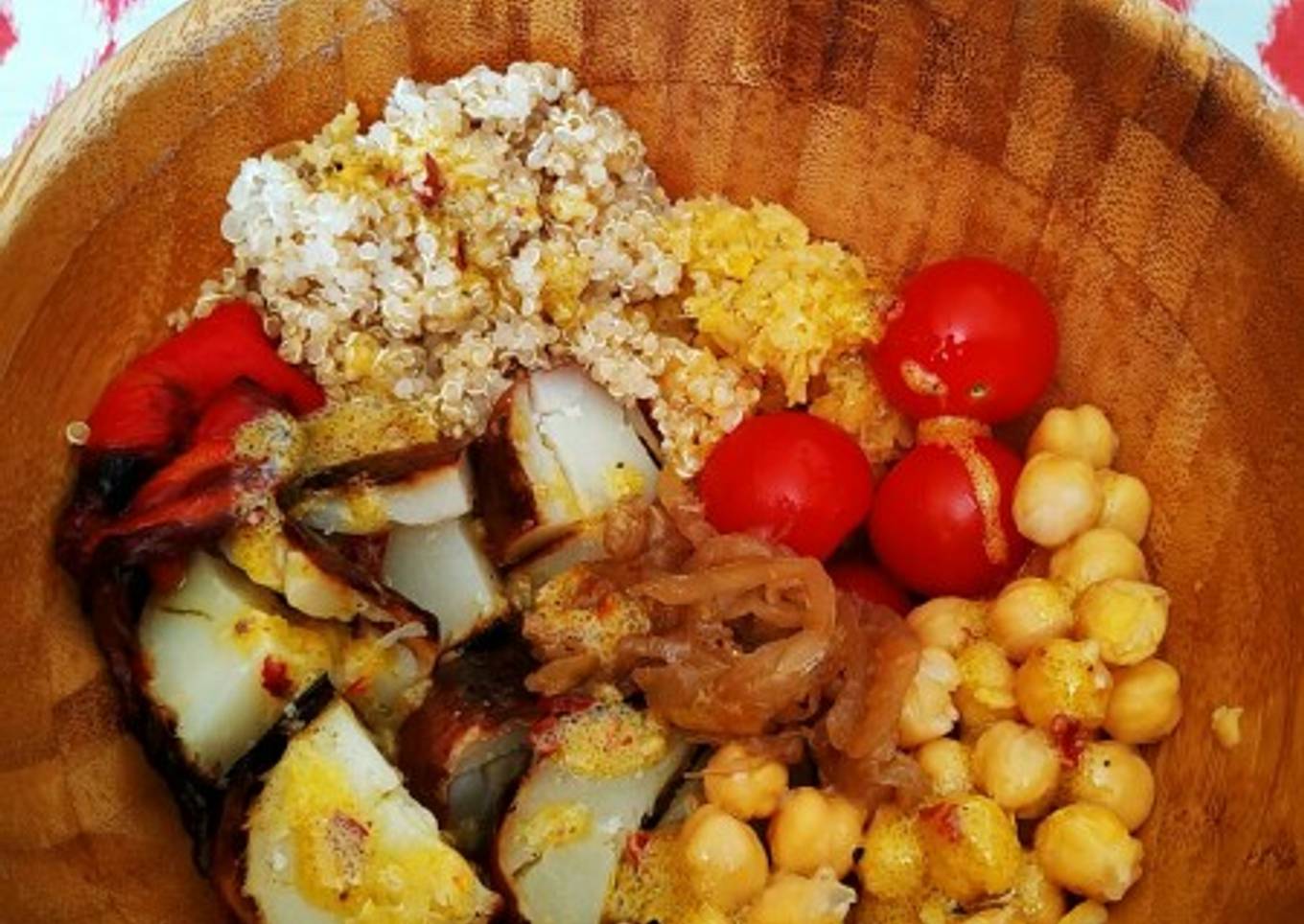 - Colocar la quinoa, las lentejas, los garbanzos en el bol, y pelar el pimiento para después colocar en tiras también. Cortar la patata en 4 y colocar también. Añadir la cebolla caramelizada.