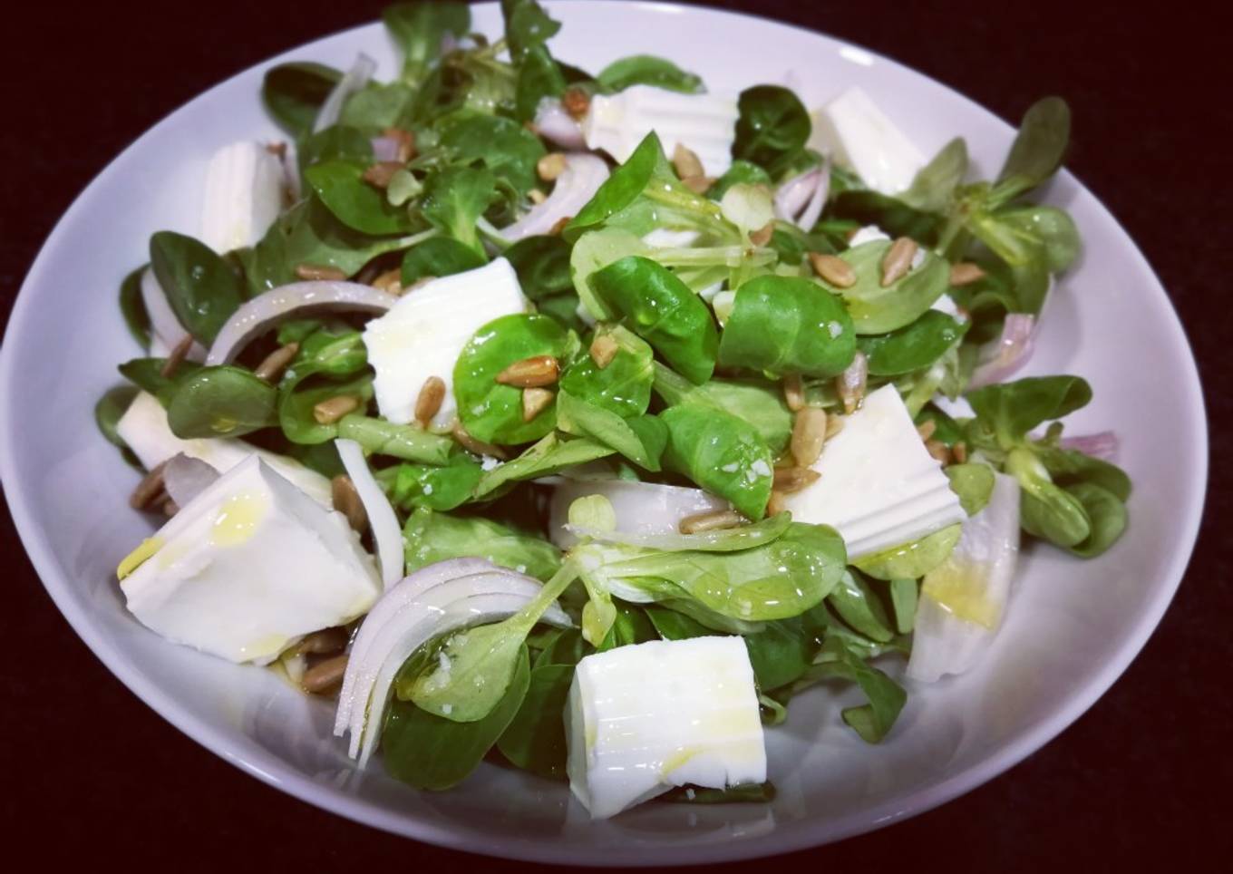 Ensalada de canónigos con queso fresco 0% y semillas de girasol
