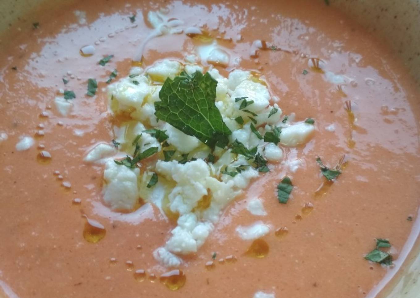 - Añadimos la pimienta y el orégano, el vinagre y el AOVE. Trituramos todo bien fino. En caso de no tener una buena batidora lo pasaremos por el chino. Refrigeramos mínimo 1 hora. Para emplatar, colocamos en un bol ¾ partes de salmorejo. Adornamos con unas migas de feta, un poco de hierbabuena muy picada y unas gotas de AOVE.