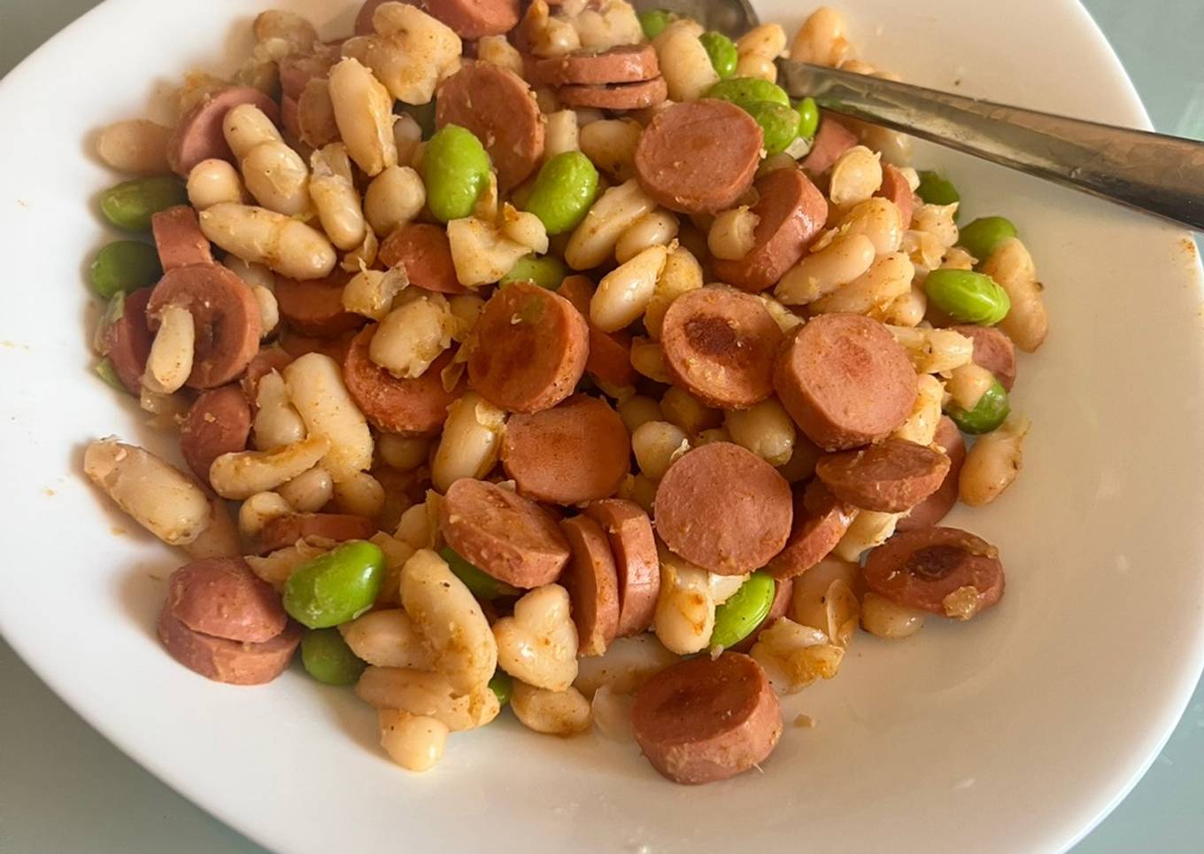 - Añadimos las Alubias y las vainas del Edamame a la sartén junto a las salchichas a fuego medio y añadimos una pizca de cada especia.