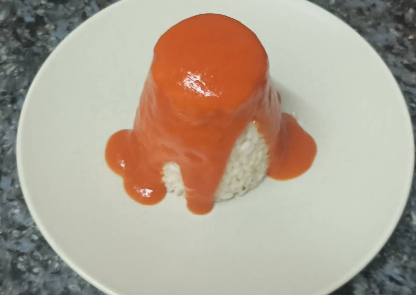 Y volvemos a poner 6 minutos, temperatura Varoma, velocidad 5. - Ya solo nos servir el Arroz con tomate frito (frío o caliente según gustos) y añadirle huevos fritos (quién quiera).