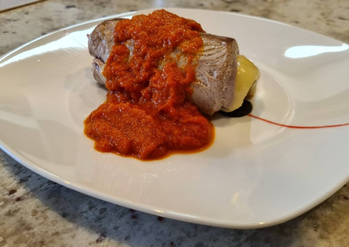 Solomillo relleno de jamón y queso con salsa de piquillos